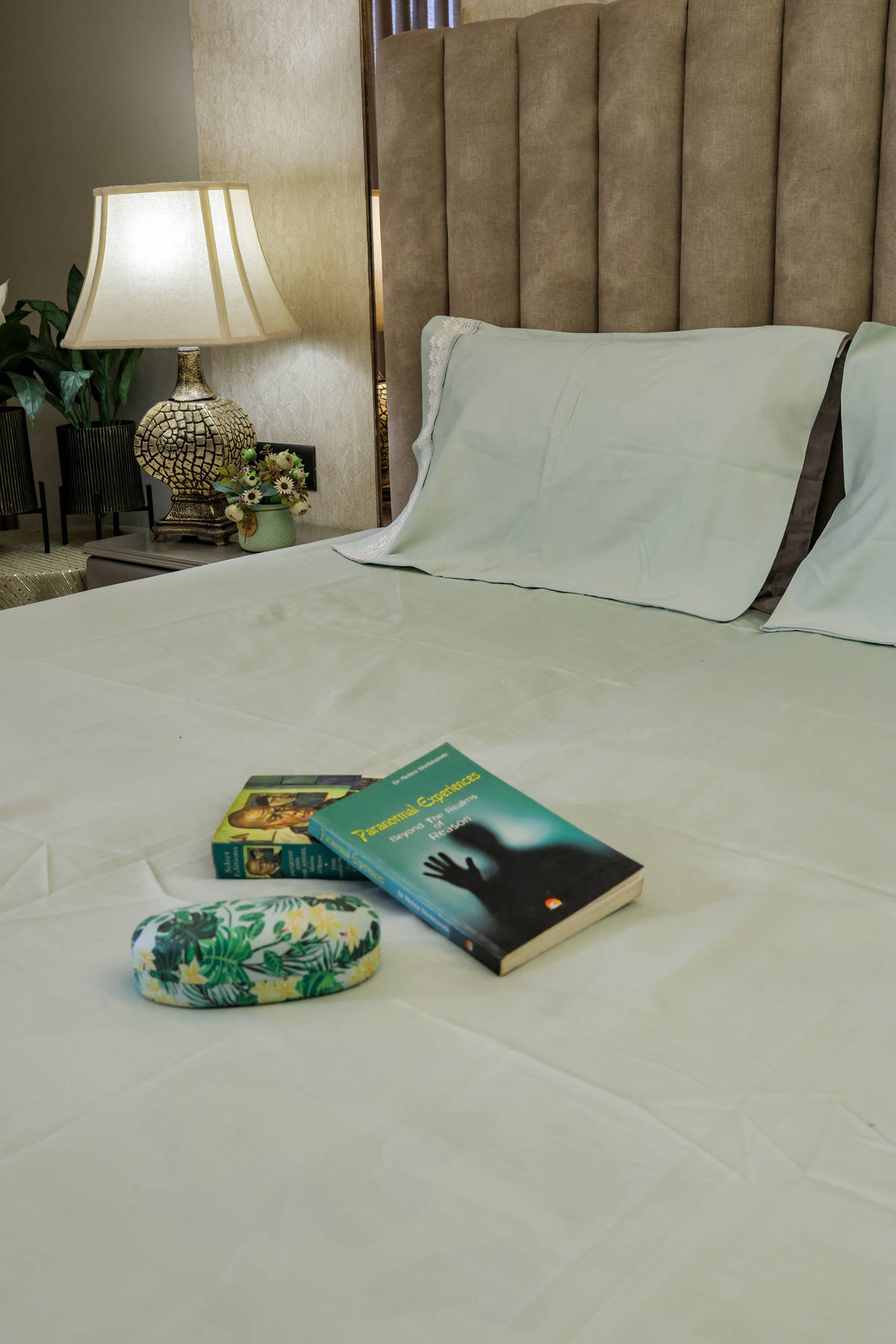 This king-size pistachio green bedsheet set exudes understated elegance and timeless charm.