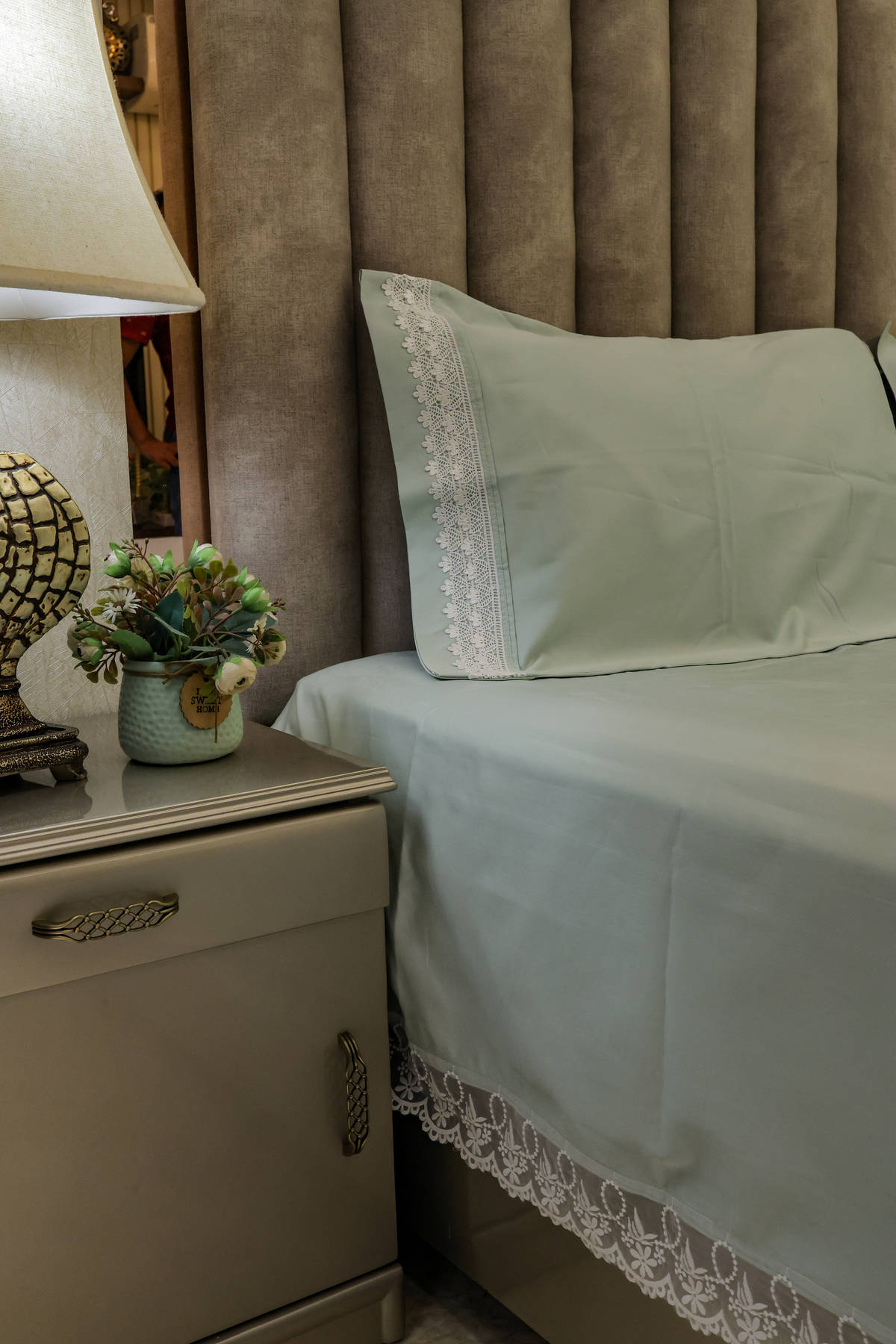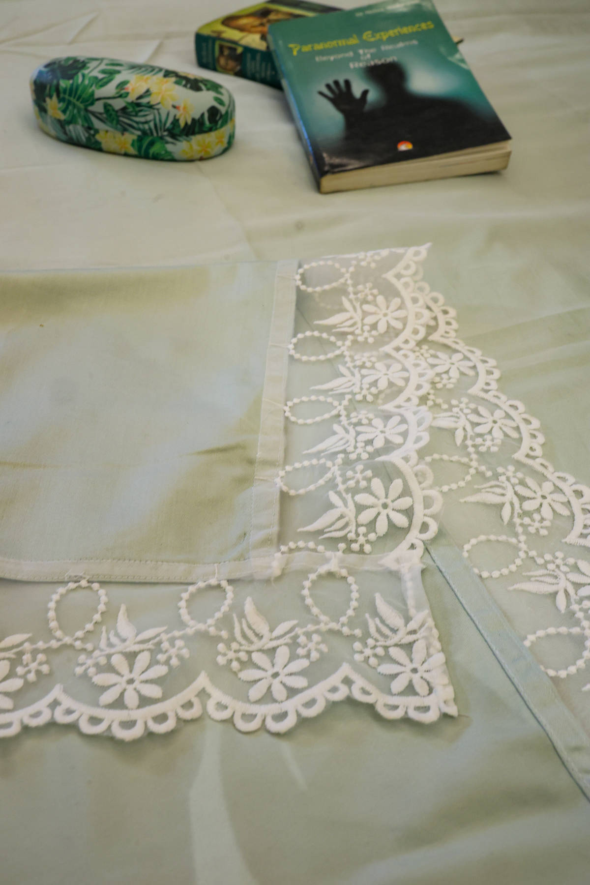 PISTACHIO GREEN KING-SIZE BEDSHEET SET WITH WHITE LACE DETAILING