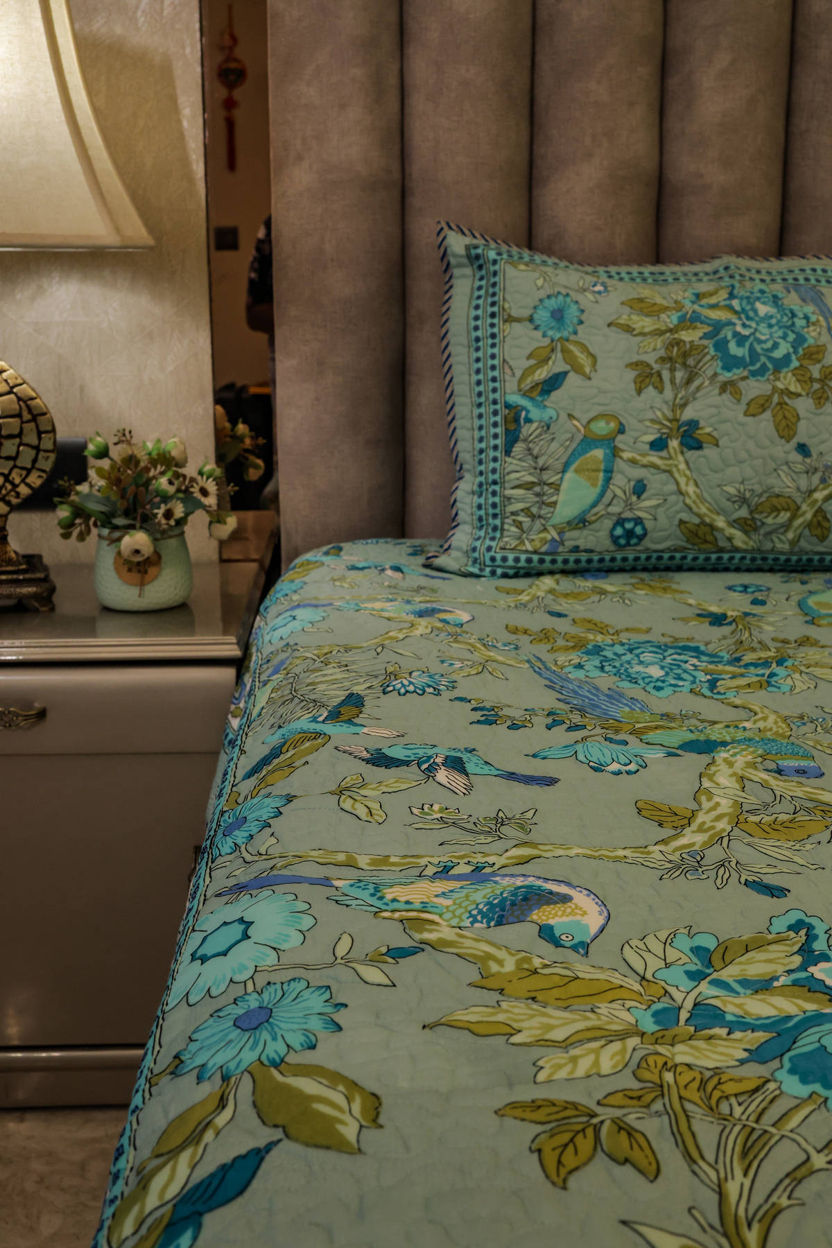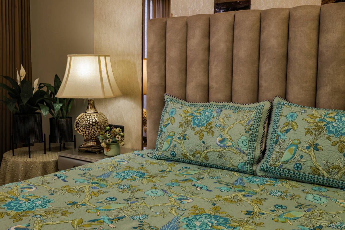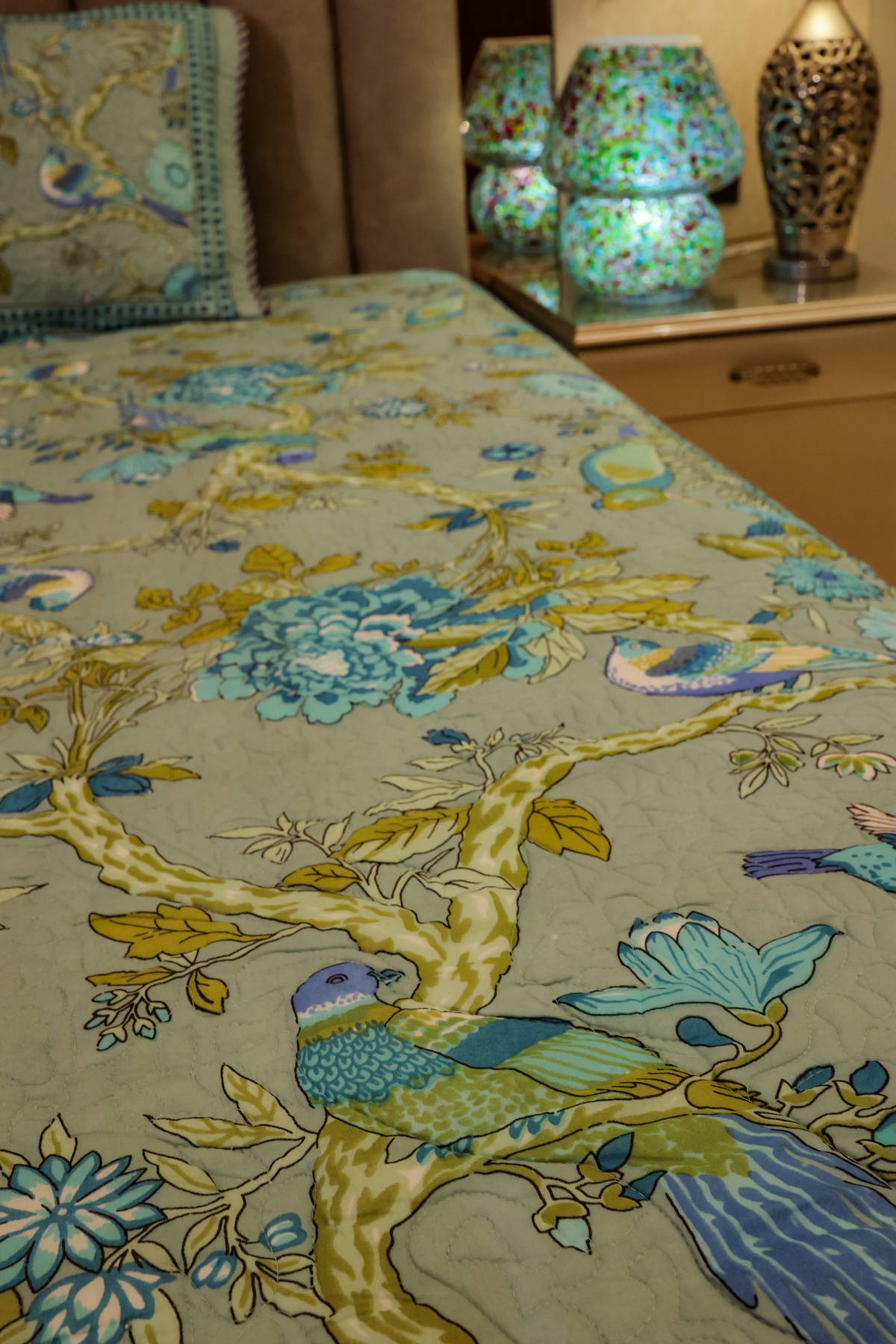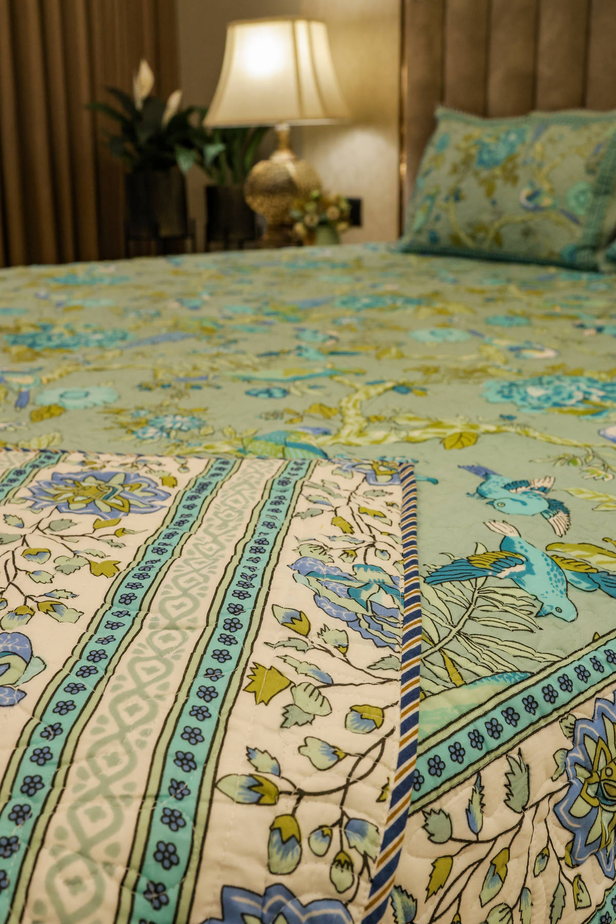 both adorned with exquisite hand block prints of birds, flowers, and leaves in calming shades of blue, green, and camel.